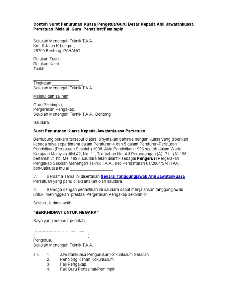 Contoh Surat Penurunan Kuasa Kepada Jawatankuasa Persatuan Pdf