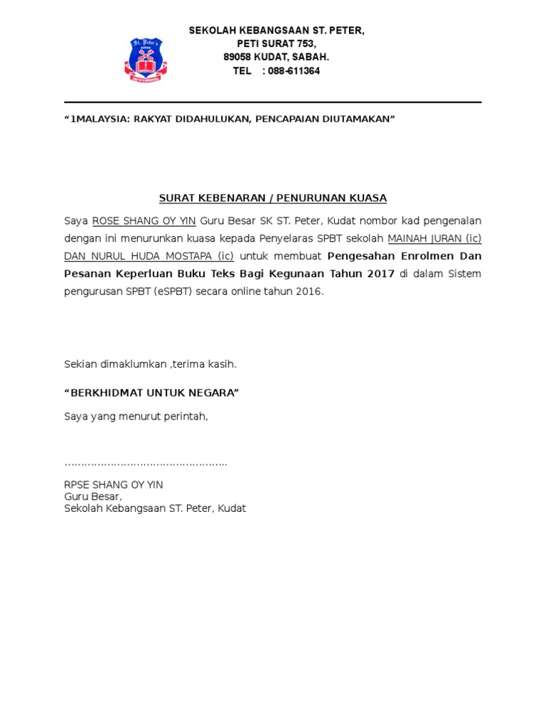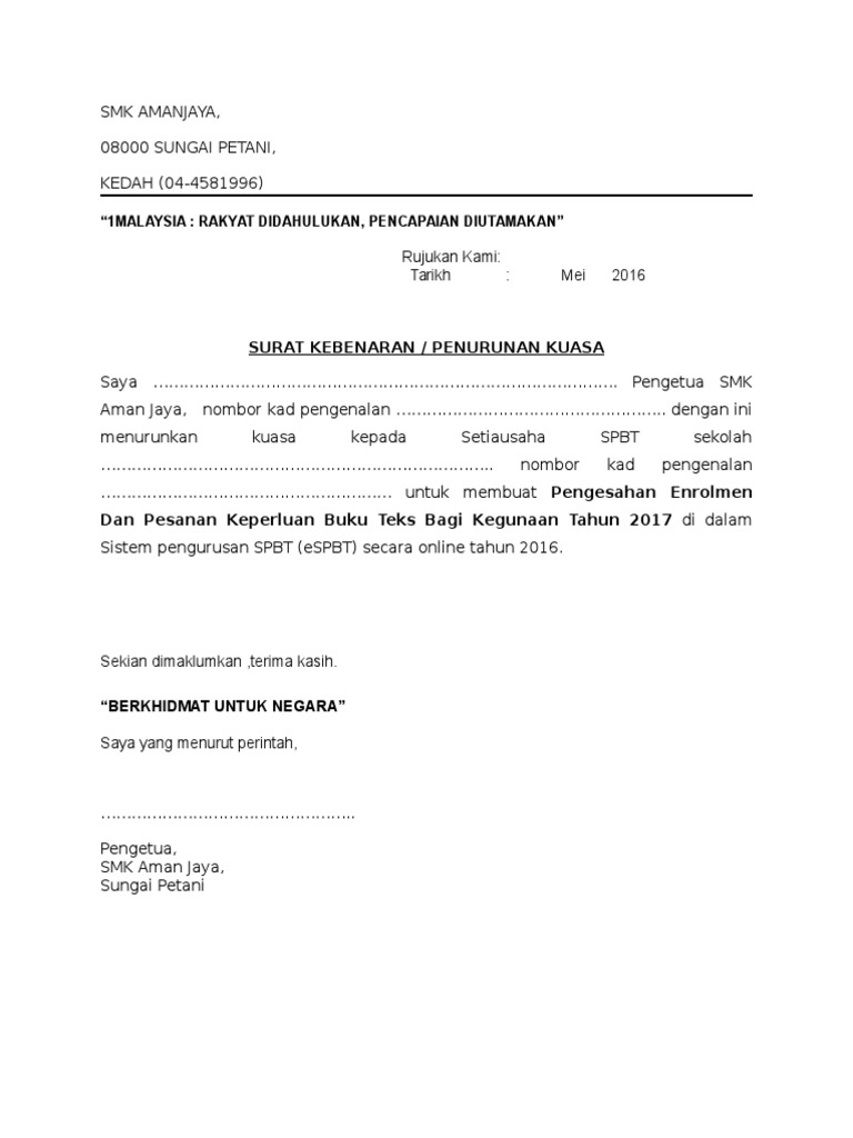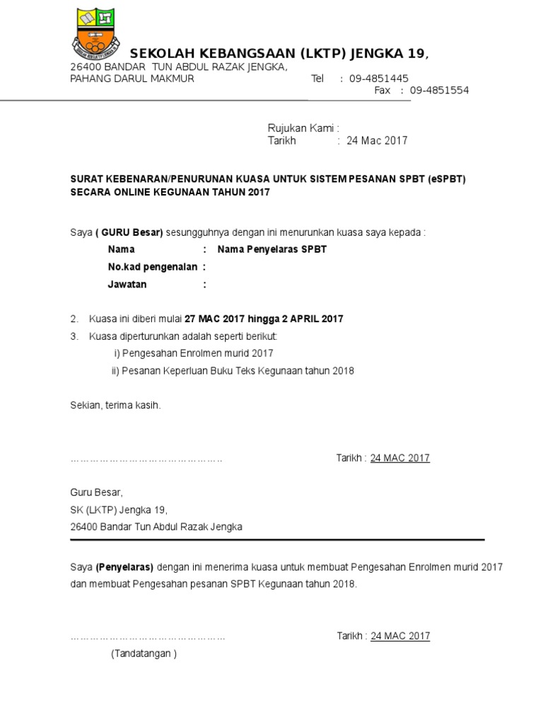Contoh surat penurunan kuasa pengetua pdf lampiran 11 contoh surat penurunan kuasa pengetua otosection contoh surat rasmi permohonan bantuan otosection share. Dikutip dari buku penuntun membuat gugatan karya jeremias lemek 2010. Contoh Surat Penurunan Kuasa Spbt Kebenaranpenurunan kuasa untuk sistem pesanan spbt espbt secara online kegunaan tahun 2016saya hajah normah binti abdul latif guru besar.
