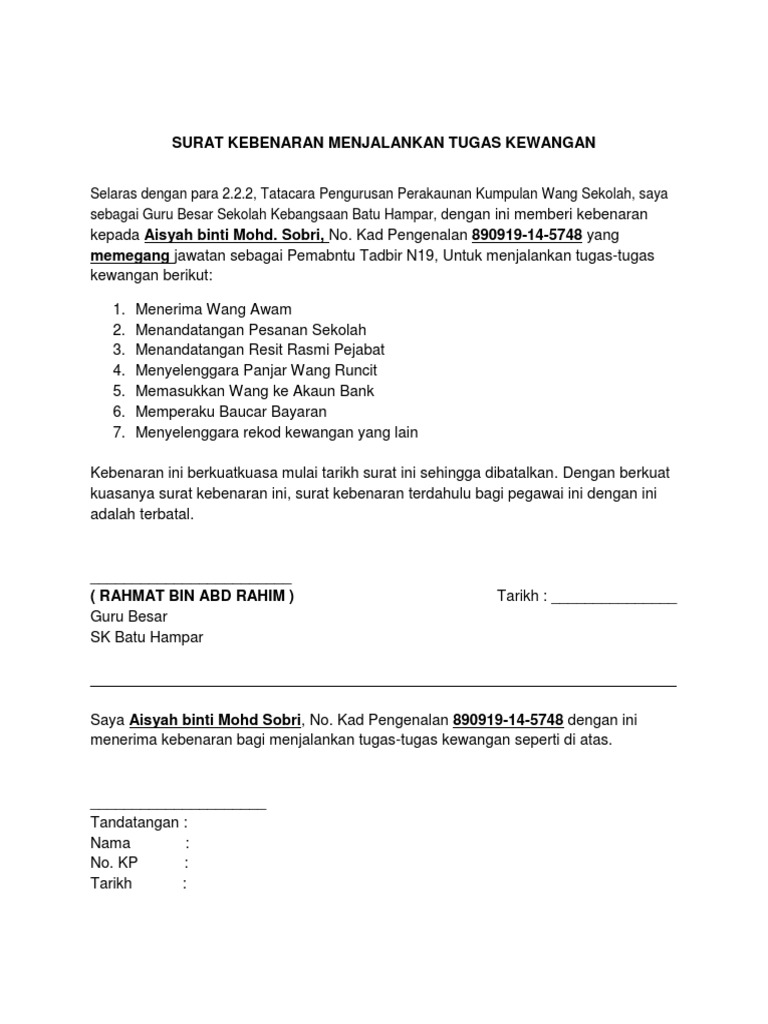 Contoh Surat Penurunan Kuasa Kewangan Sekolah